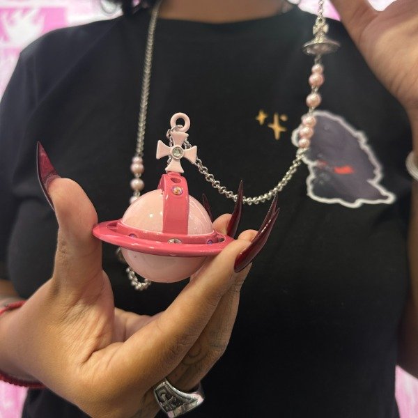 Hecho con aleación de zinc resistente, con un acabado de pedrería. Cadena Acero Inoxidable. Mini orbes de Acero Inoxidable.